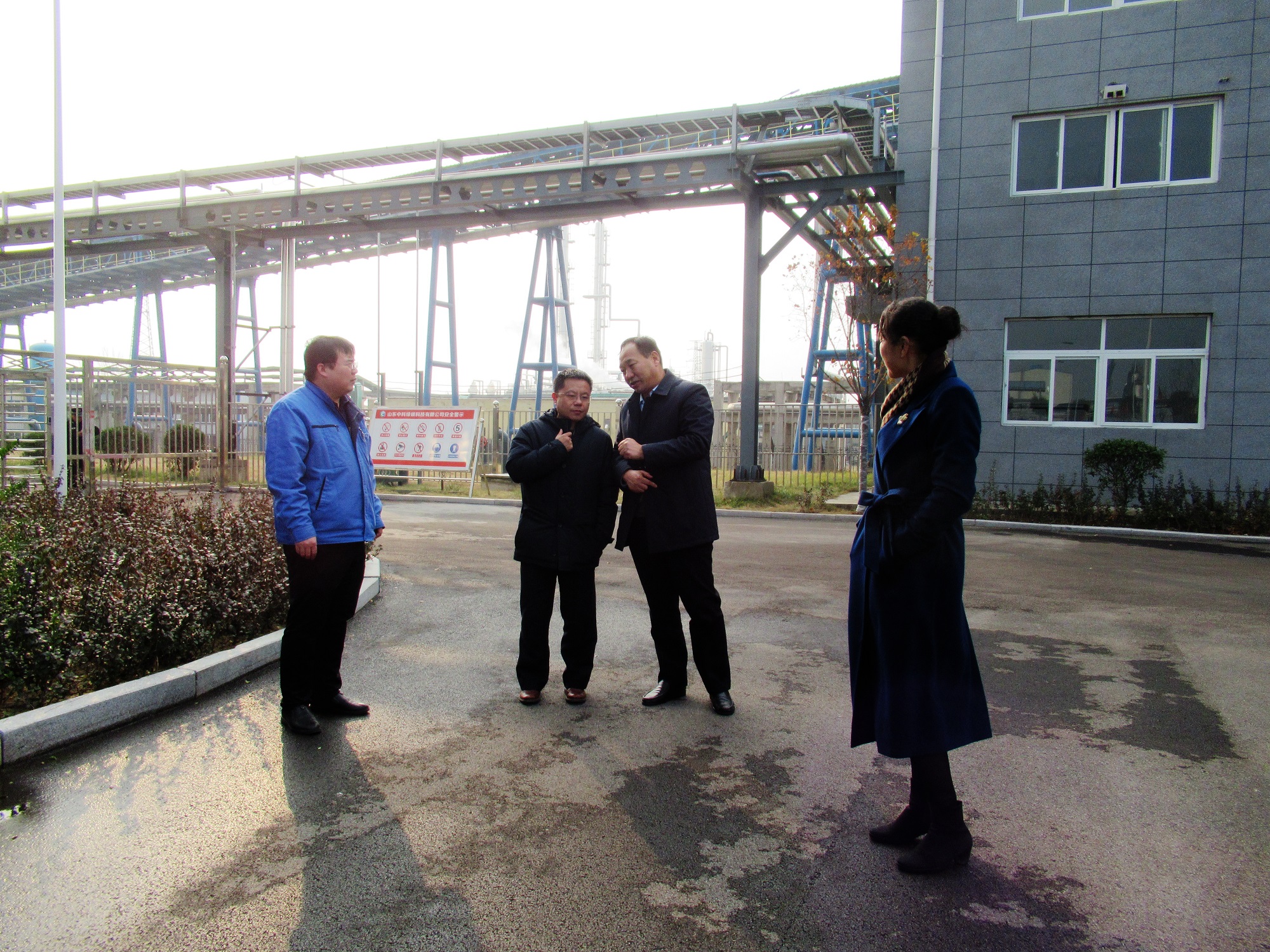 孫洪剛首先參觀了維度公司,認真聽取老區(qū)的情況介紹,并對老區(qū)周邊狀況進行了考察。隨后對中科綠碳科技公司進行了參觀,聽取了DMF裝置試驗、成果鑒定、新工藝節(jié)能減排和中試平臺運行等情況。