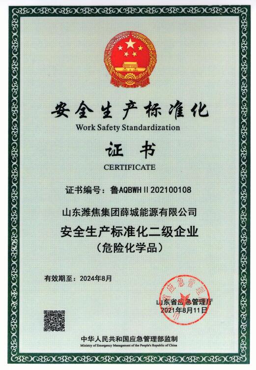 近日,山東省應(yīng)急管理廳發(fā)布山東危險(xiǎn)化學(xué)品從業(yè)單位二級(jí)安全標(biāo)準(zhǔn)化達(dá)標(biāo)公告,山東濰焦集團(tuán)薛城能源有限公司順利通過(guò)二級(jí)安全生產(chǎn)標(biāo)準(zhǔn)化審核認(rèn)定。